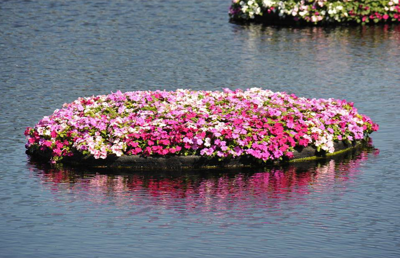 百奧源浮動(dòng)濕地為季節(jié)型草花提供良好的生長(zhǎng)環(huán)境,花卉直接在纖維載體中生長(zhǎng),維護(hù)便捷,適用于多種景觀植物,形成獨(dú)具特色的水上園林景觀。