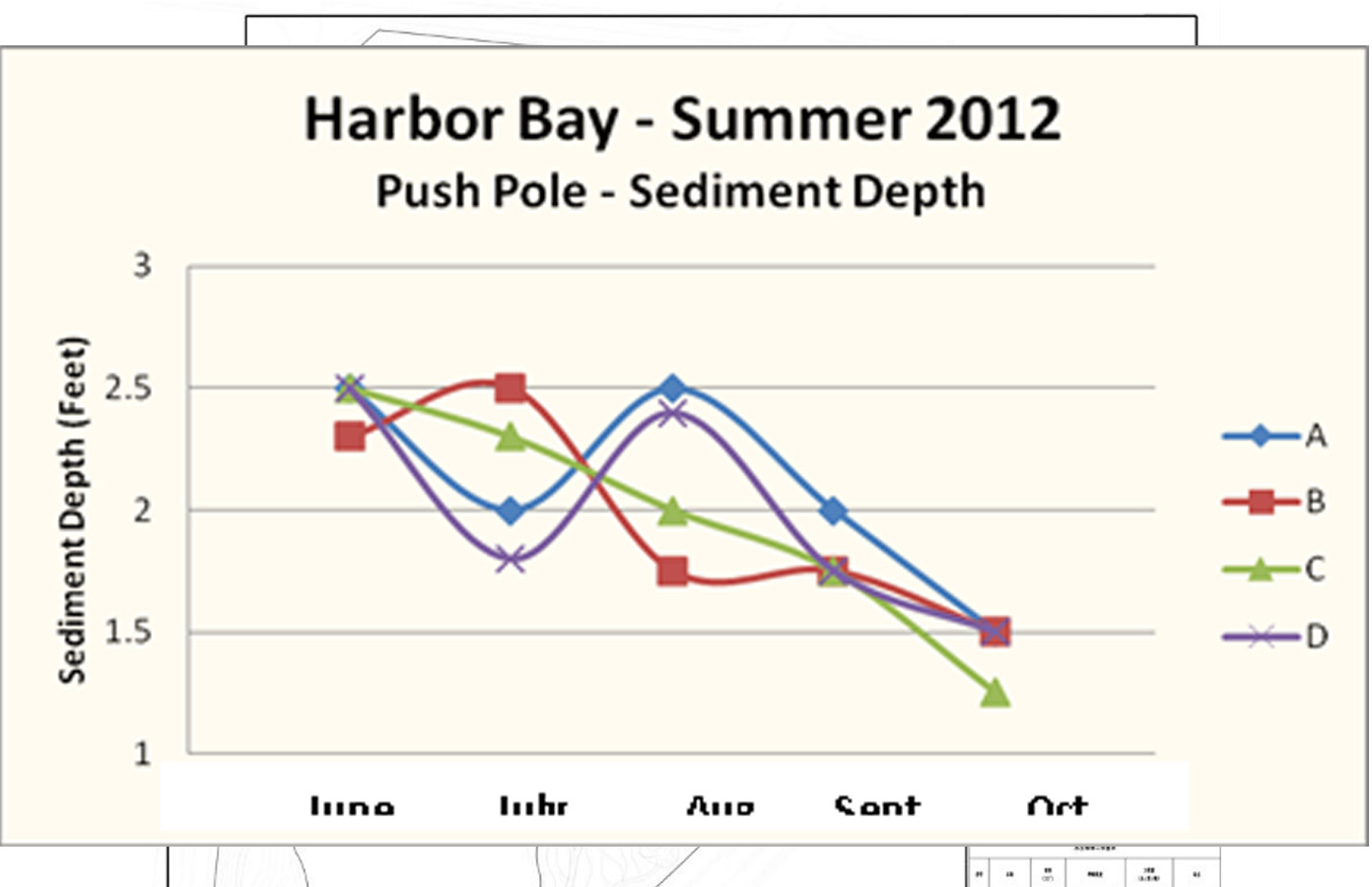 使用奧科?太陽(yáng)能循環(huán)復(fù)氧設(shè)備4個(gè)月后,對(duì)Madison湖的底泥進(jìn)行測(cè)量。測(cè)量結(jié)果表明,在奧科?太陽(yáng)能循環(huán)復(fù)氧設(shè)備使用后,底泥深度明顯變淺。2012年6月-10月之間,測(cè)量點(diǎn)底泥消減量平均為30厘米。